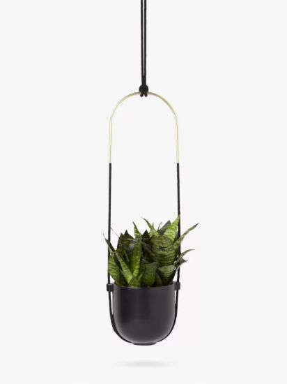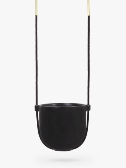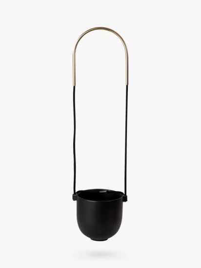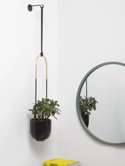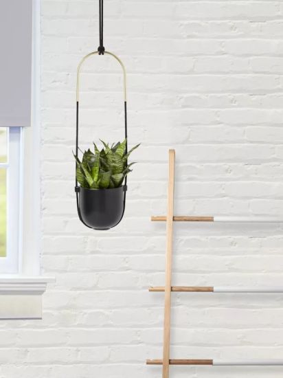 - Hanging plants add a sense of height to a space. The ceramic planter is suspended by a matching rope design, and the curved metal with a brass finish creates a modern feel. Easy to mount on the wall or ceiling, it's perfect for ferns, succulents, and other greenery to bring the beauty of the outdoors indoors. Matching hooks and accessories included.