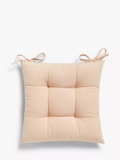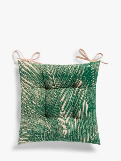• This polyester filled seat cushion features a hand-screen printed palm leaf fabric on the front and a pale pink back. Can be used reversibly.